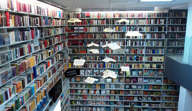 Un crean cubo de hormigón define metricamente el edificio ocultando la fachada original en un segundo plano, y permitiendo la visualización de los estantes dedicados a catalogar los 20.000 libros que forman parte del índice de la colección de la biblioteca y los puestos de venta de la librería, mediante una gran cristalera que ocupa la totalidad de la fachada.