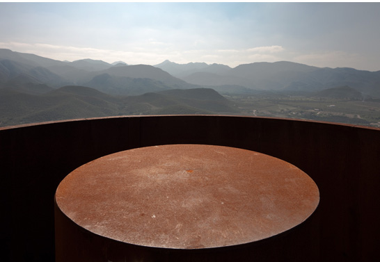 De esta forma los arcos y los materiales conviven con apéndices fabricados en acero corten, un pulido contenedor da la bienvenida a los visitantes, dispuesto en la base de la loma, el leve desnivel se salva mediante un camino que conduce al umbral de la torre, desde donde se asciende por una escalera de caracol que conduce al mirador.