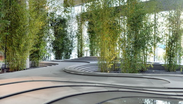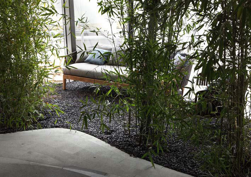 El medio ambiente y la arquitectura escultórica, suponen una propuesta arriesgada, que navega entre lo abstracto y lo natural. Un jardín japonés compuesta por capas realizadas de piedra pietra serena, bosques bambú regado por un sistema por goteo bioclimatiza el ambiente a una temperatura constante de una forma natural.