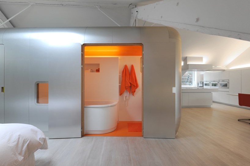 Dividiendo la planta una cápsula modular fabricada en acero divide el espacio, concentrando los usos domésticos. Sanitarios, cocina, soluciones de almacenamiento varias además de los sistemas de calefacción y ventilación racionalizan el espacio de forma funcional por áreas.